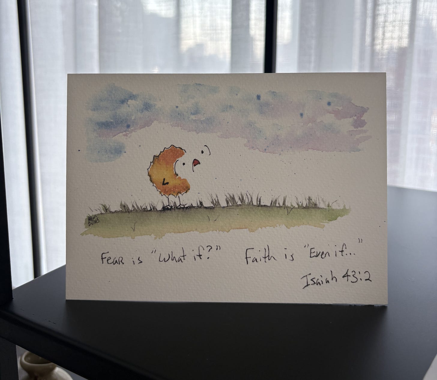 On a recent walk through Central Park, I stopped in front of a display of watercolor paintings of a chicken — a small, yellow, wide-eyed bird, each one paired with a line of scripture or a simple, handwritten quote.